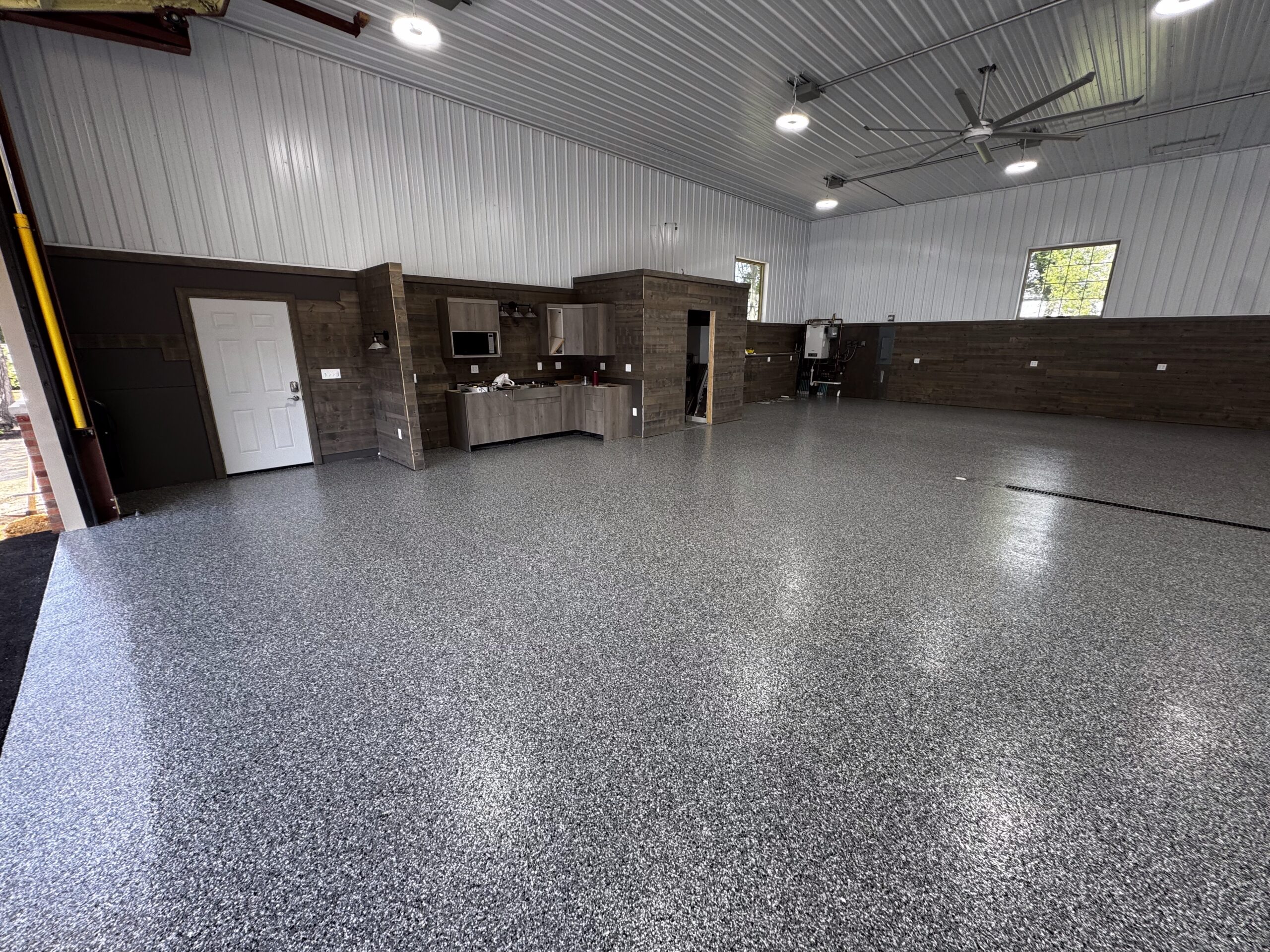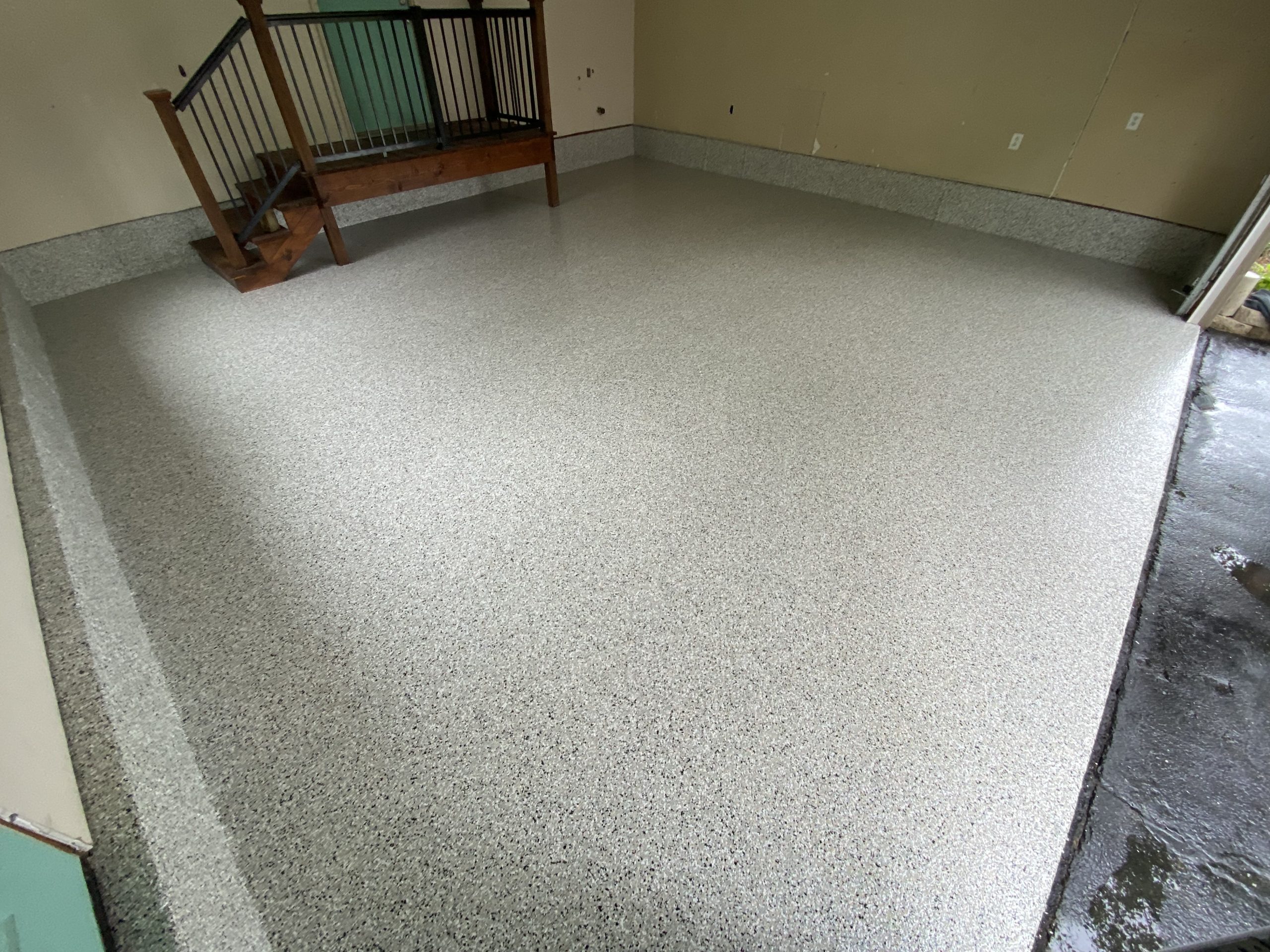 We broadcast our decorative flakes "to rejection," meaning we cover every inch of the floor until the base coat can't hold any more. This doesn't just look great—it provides anti-skid protection and incredible impact resistance.